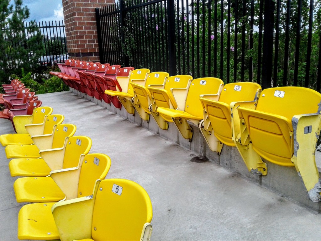 Visitors to the memorial can relax behind the “outfield” in one of the 100 or so colorful seats held back when the stadium was demolished in 2012.