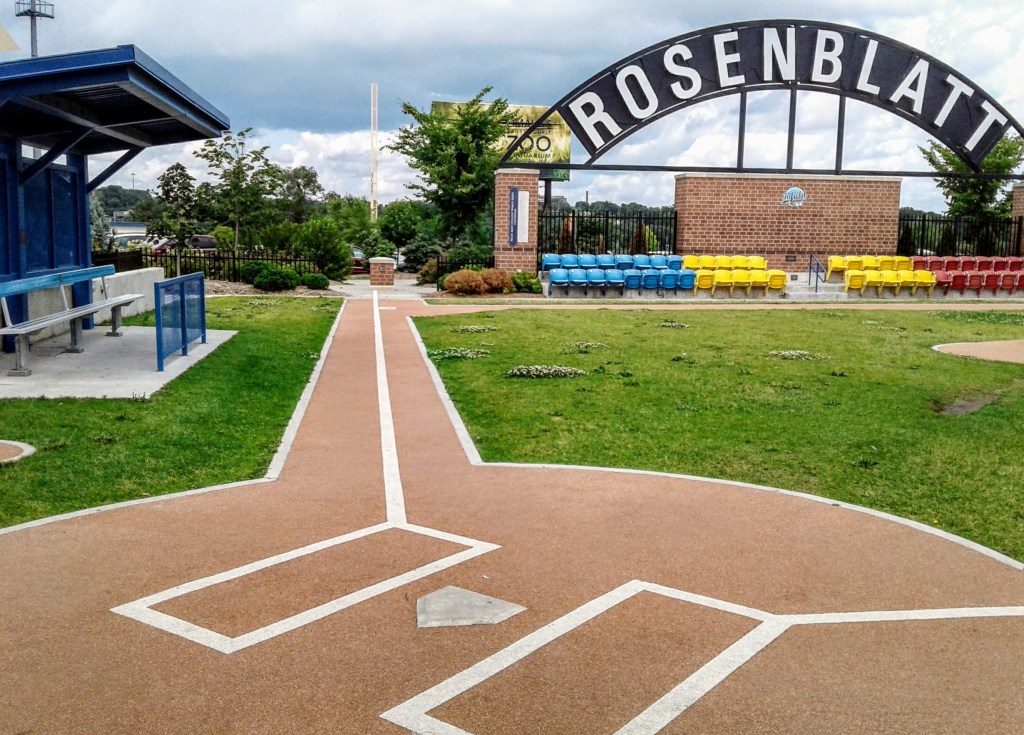 Rosenblatt’s home plate is on display at the Baseball Hall of Fame museum in Cooperstown, NY so a replica now sits where the original was. The bases for the wiffle ball diamond are much closer to home plate than the standard 90 feet for college and pro games that were played here.